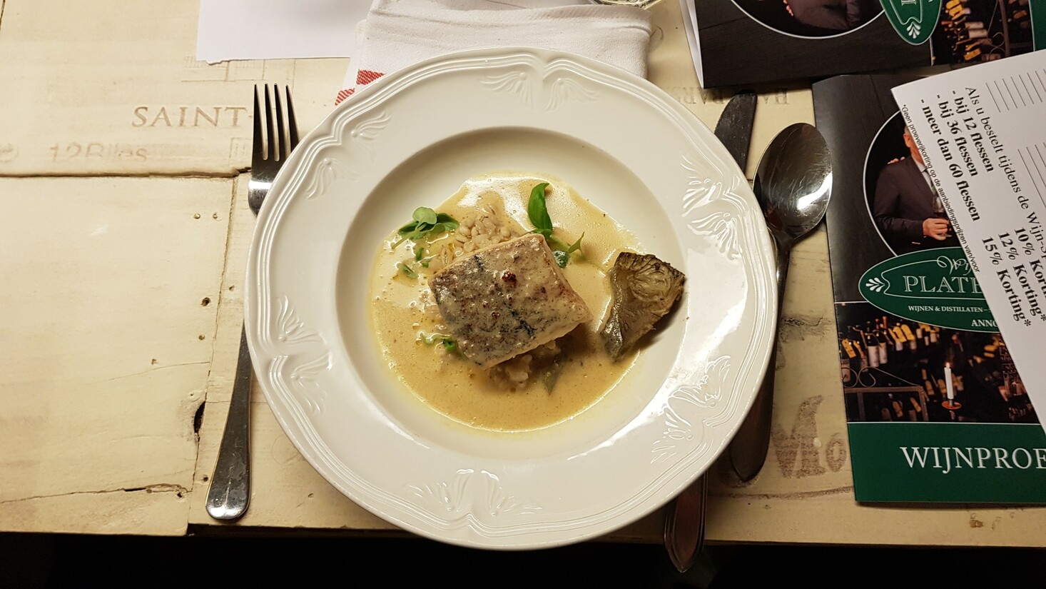 Julien is het soort man dat je in volle overgave weet te vertellen dat de Spaanse Albariño gemaakt is met druiven die groeien in de schaduw op de berg, waar de wind zorgt voor een lichtzilt element dat je terugvindt in de smaak en dat dat de reden is waarom hij zo goed past bij de vissoto al dente. En dat klopt, dat van die smaak dan. Het gerecht heette natuurlijk niet zo, dat was een heerlijk bordje met vis en al dente risottorijst met een nootachtig stukje dat leek op artisjok en ik vind dat het ook artisjok was, maar wat weet ik nou van eten.