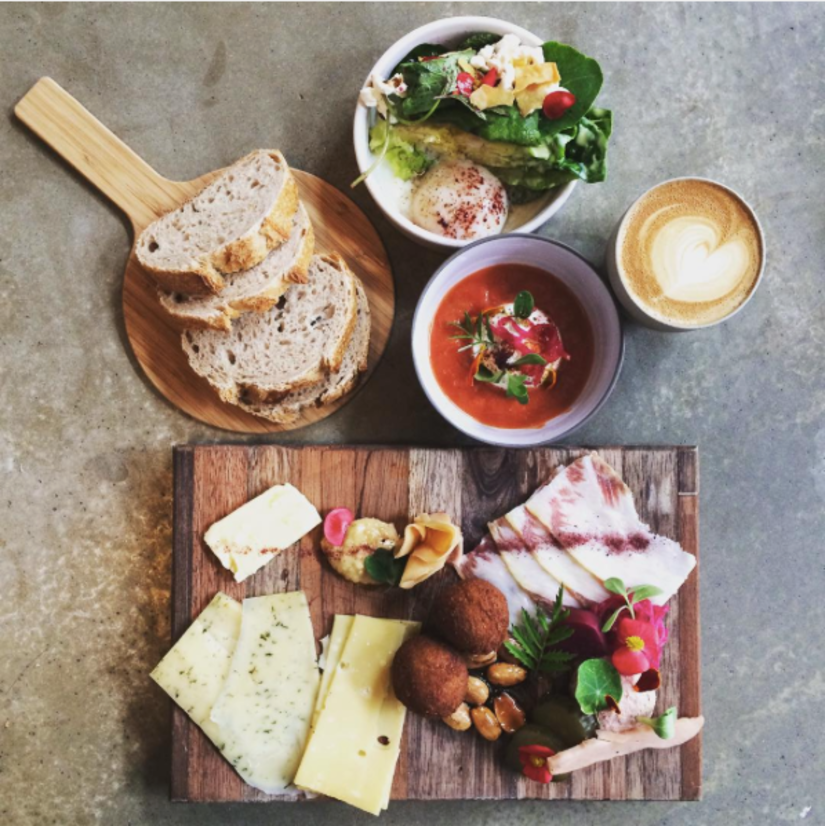 Wat: oeuf en cocotte (een eitje uit de oven), frittata met geitenkaas, doperwten en munt, salade met wilde zalm, spinazie en citroenricotta, vers brood van Menno, smeersels, jam en taartjes.