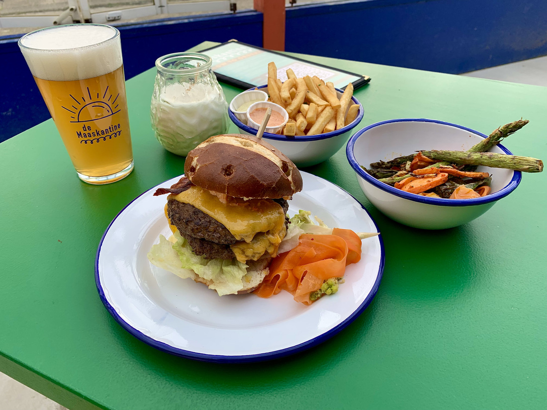 Stel het is een graad of 25 en je hebt een kater en je staat midden in de stad. Het zweet breekt je uit en de hitte van het asfalt lijkt zich op jou te concentreren. Je moet zo snel mogelijk naar wat verkoeling maar de trein of metro richting het strand zou je fataal worden. Kies in de dit geval voor De Maaskantine voor de verkoeling van een briesje van de Maas op je voorhoofd. Als je eenmaal een zelf samengestelde smash burger hebt verorbert en een halve liter pils achterover hebt geslagen, ben je al lang en breed weer vergeten dat je je zo slecht voelde.