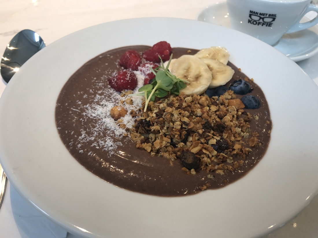Bij de koffiebar van Man Met Bril Koffie in de Hofbogen heb je alles wat bij de ochtend hoort; koffie, ontbijt en wifi... De chia bowl met een sterke combinatie van blauwe bessen en pecannoten is een aanrader, en ook hebben ze een açaí met frambozen, geraspte kokos, cacao en amandelen.