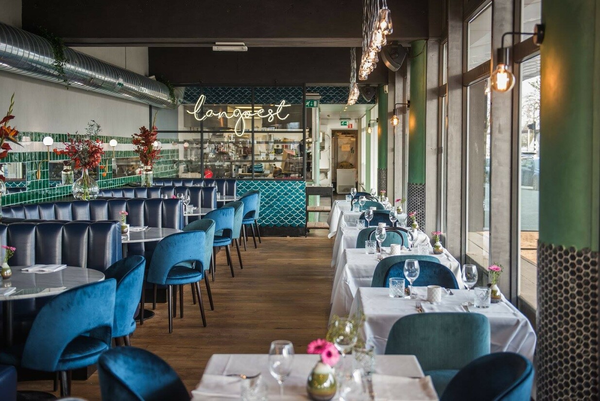We dagen jullie uit om een hoekje te vinden in visrestaurant Langoest dat niet fotogeniek is. De blauwe bar met geschubte tegeltjes, de velvet stoelen en de lichtgevende kreeft op de muur, ze doen het allemaal heel goed op camera. Met het uitzicht op de Maas kun je je flink uitsloven.