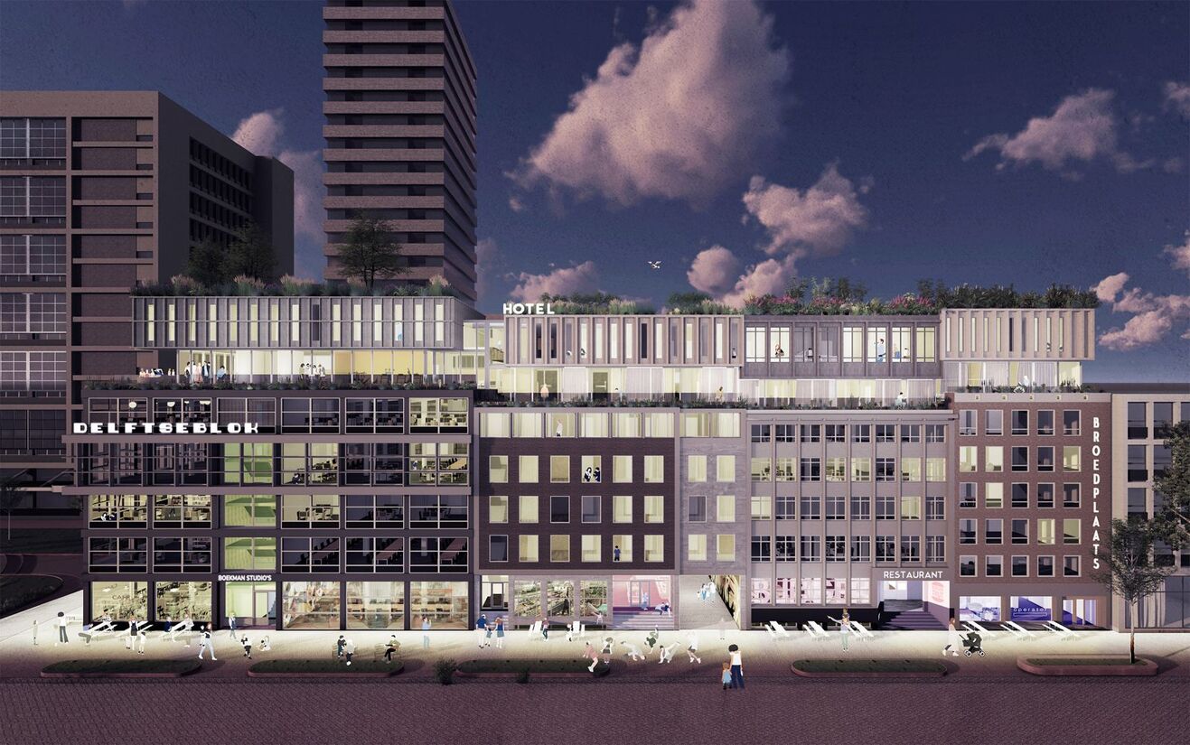 Onder het plan van het Delftseblok moet het Schiekadeblok straks huisvesting bieden aan het Volkshotel, restaurant, urban deli, co-workingspace en het moet een creatieve broedplaats worden.