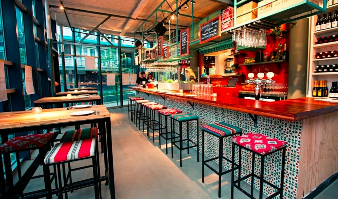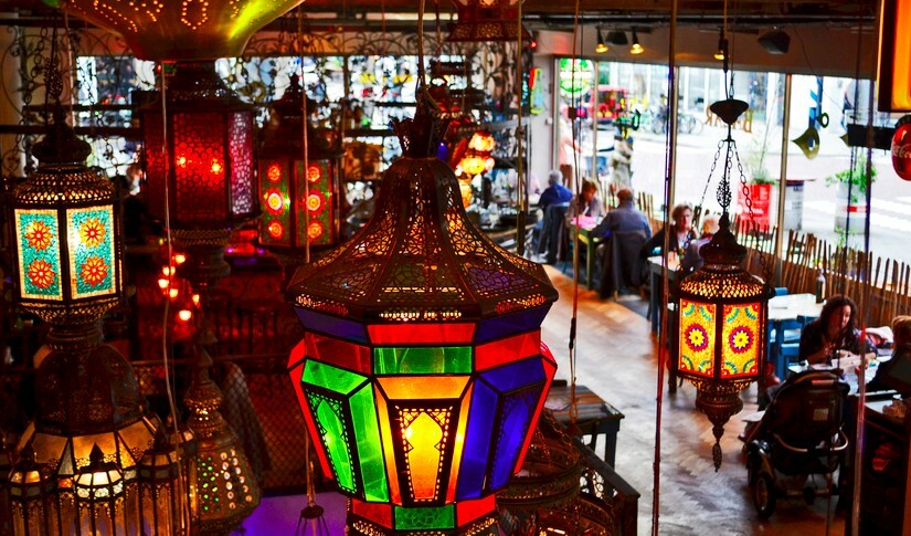 Misschien niet het vernieuwendste interieur, maar daarom zeker niet minder bijzonder. Met de vrolijke kleuren en warme belichting nodigt hotel/restaurant Bazar aan de Witte de Withstraat uit tot binnenkomen. Als je hier binnen stapt, waan je je even in een Marokkaanse souk. Ook de gerechten op de kaart zijn afkomstig uit het Midden-Oosten en Noord-Afrika en worden vaak geserveerd in een traditionele tajine.