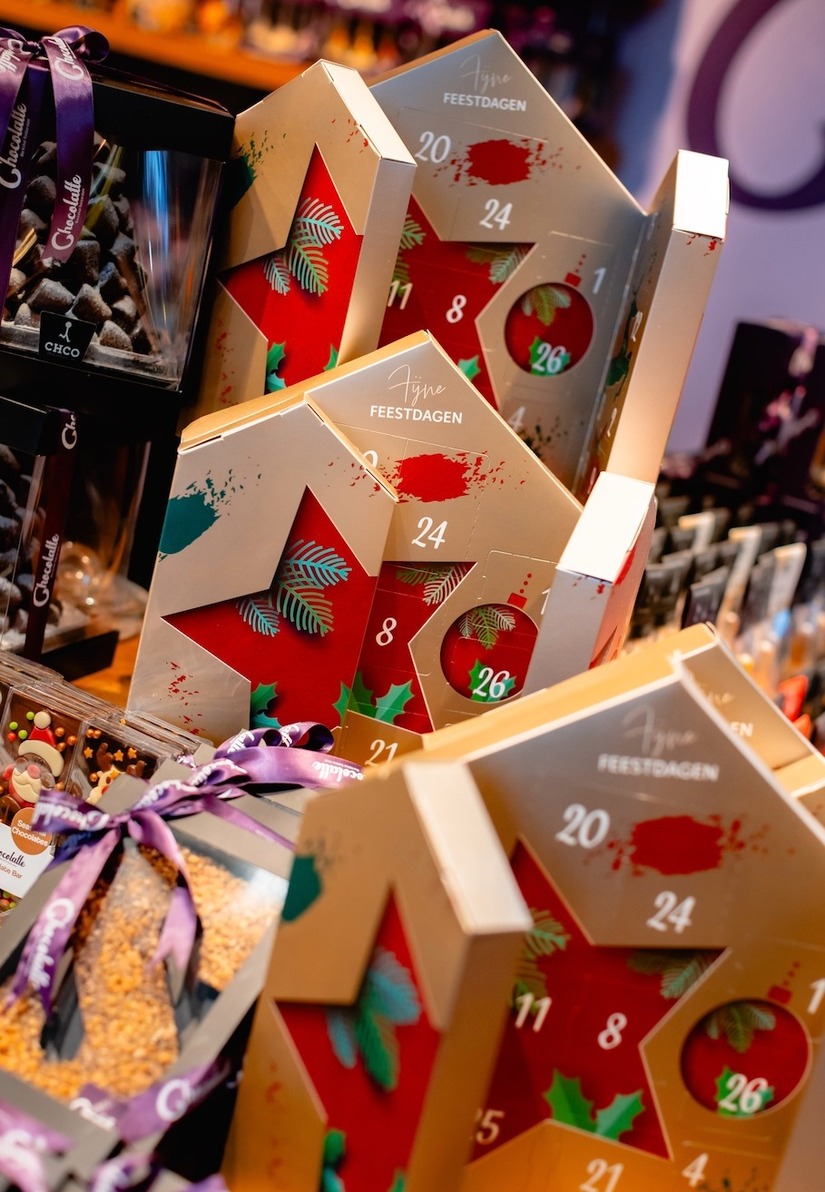 En natuurlijk een feestelijke chocolade-adventskalender, perfect om cadeau te doen, of gewoon lekker voor jezelf.