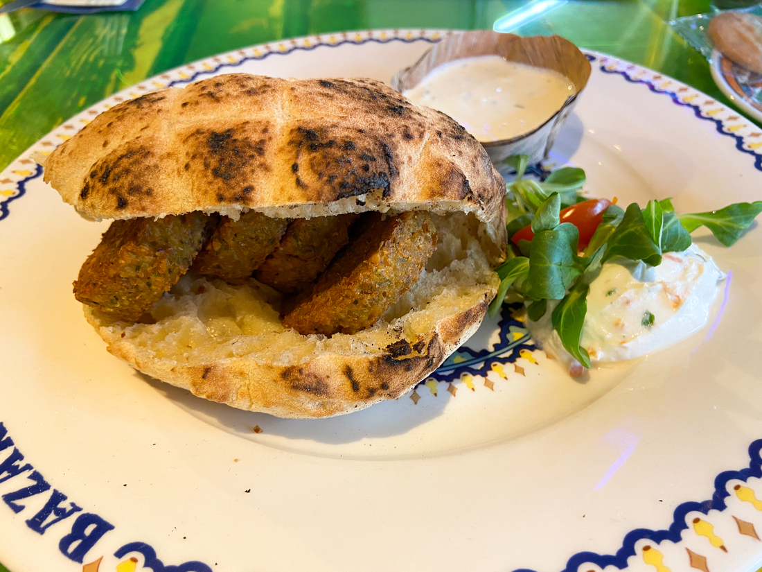 Als je je broodje falafel het liefst als stevig ontbijt bestelt, zit je bij Bazar goed. Hier haal je de lekkernij op weekdagen al vanaf 08:00 uur. De pita falafel van Bazar komt, in tegenstelling tot de andere pita falafels, niet met ingelegde groente of verschillende toppings. Bij het broodje krijg je een groot bakje knoflooksaus en een schepje yoghurtsaus met wat sla en een tomaatje. De pita is erg knapperig en de falafels zijn zacht en goed op smaak.