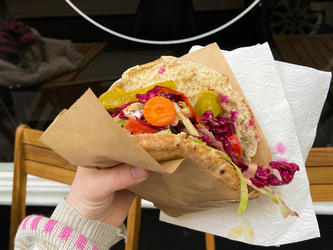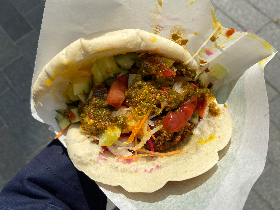 Bij Mecca hebben ze voor je gekozen welke toppings je op je pita falafel krijgt, en wat kunnen ze dat goed! De drie grote falafelballen zijn ontzettend knapperig en het broodje van zuurdesem is ook perfect knapperig. De pita zit zo vol met toppings dat het broodje er haast onder bezwijkt. De kruidenpasta - zhoug - en de yoghurt-tahini saus gaan enorm lekker samen met de falafels. Let op: wel messy eten.
