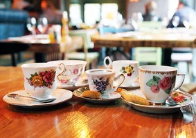 In het restaurant valt ons oog een nostalgische zithoek en prachtige grote houten tafels met opgehoogde chesterfields. 'Ga lekker zitten,' verwelkomt gastvrouw en eigenaresse Lisette Lankhaar ons. Geen twee kopjes, valt ons op, zijn hetzelfde en het tafelservies lijkt zo uit grootmoeders vitrine gehaald.