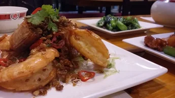De spicy Singapore krab wordt begeleid met kleine, licht zoete, bao bao broodjes waarmee we de saus kunnen opvegen. Jemig, wat hebben we hiervan genoten! Tijdens al dit eetgeweld, creëren drie dim sum hapjes een moment van rust, waar het krokant gefrituurde exemplaar met kievitsei omgeven door een omhulsel van garnalen, een vreugdekreetje aan ons ontlokt.