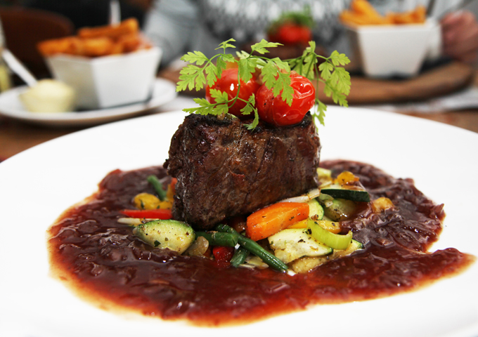 Mooi. Kunnen wij even uitgebreid de kaart bekijken. Want die is behoorlijk groot, veelzijdig en ziet er voor een plaatselijk wapen best culinair uit. Sommige gerechten hebben een gewone eigentijdse naam en spreken voor zich. Maar er zitten ook echt middeleeuwse happen tussen. Kasteelbrood met aioli. Het Galgenmaal, een Italiaans gekruide vleesspies van varkenshaas, spek, ui, paprika en pepersaus klinkt bijzonder. En voor vleesmijders is er de vegetarische Kruistochtenschotel. Geinig. Wij besluiten te gaan voor gegrilde tournedos van ossenhaas met een saus van rode wijn en gekonfijte sjalotjes en de Australische Prime steak met een saus van Parmezaan en spek. Voor ridders en jonkvrouwen is er ook van alles te kiezen. Floris, Robin Hood en Ivan Hoe, respectievelijk spareribs, kipnuggets en hamburger met frietjes, appelmoes en mayonaise. Of voor de wat meer culinair ingestelde kids ‘Lady Marian’, gebakken zalmfilet met tagliatelle. Maar die is vandaag niet aan onze meiden besteed. Die willen gewoon een lekkere snelle hap zodat ze meteen weer het speelkasteel in kunnen. En dús wordt het Robin Hood.