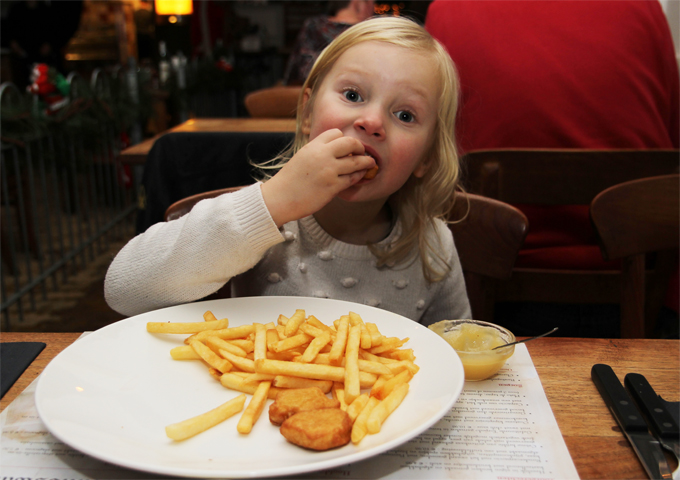 Na de biertjes en het lekkere verse Kasteelbrood met aioli, komt het hoofdgerecht. De prinsessen zijn inmiddels uitgehongerd en schuiven aan. Eigenaresse en gastvrouw Kate komt regelmatig vragen of alles naar wens is. ‘Sinds onze kok John van den Berg chef-kok is geworden, zitten we hier behoorlijk in de lift’, vertelt ze. En daar kunnen we ons helemaal in vinden. Het is lekker én gezellig. Niet alleen voor kinderen maar ook voor grote mensen. Want daar zijn ze bij het Wapen soms een beetje bang voor. ‘We hebben ons ooit geprofileerd als kindvriendelijk’, vertelt Kate. ‘En dat zijn we natuurlijk ook. Maar we richten ons ook op mensen die gewoon lekker willen komen eten, zónder kinderen. Daarom is de speelhoek ook een afgezonderd stuk van ons restaurant.’