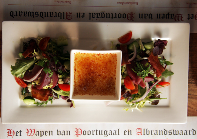 Maar eerst bier. Want vlees moet zwemmen. Ook daar zijn ze bij het Wapen van Poortugaal goed in voorzien. Naast high tea’s en high wines, organiseren ze hier namelijk ook met enige regelmaat high beers. Dan schenken ze Hertog Jan en speciale donkere zware bieren van de tap. We laten ons verrassen door Kate en even later proeven we een paar behoorlijk zware, maar smaakvolle biertjes. Perfect voor een koude winteravond als deze. We voelen ze al snel zitten. Misschien toch maar niet helemaal opdrinken al die glazen, want we moeten natuurlijk nog wel terugrijden naar Rotterdam.