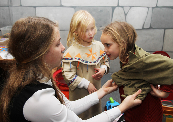 Tegen de achterwand is een groot middeleeuws tafereel geschilderd. Compleet met jonkheren, jonkvrouwen, kasteeltorens, kantelen én nobel ros. ‘Door mijn vader gemaakt’, vertelt eigenaresse Kate Snoek. ‘Het is onze eigen familie.’ Dat spreekt bij de dames tot de verbeelding. Ze rennen naar de muurschildering en ontdekken dat er aan de zijkant een deurtje is. Ze gaan naar binnen en komen terecht in een mini speelparadijs, met verkleedkist, reuze vier-op-een-rij spel, een tekentafeltje én jawel, het ballenbad. En een lieve nanny om de boel een beetje in de gaten te houden. ‘Oh jó’, roept Julia uit. En weg zijn ze.