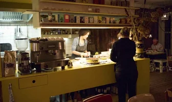 Deborah Marengo staat vanavond achter de pannen, de avond ervoor was dat Anneke van Zus Kookt, vorige week was het Anneliese, enzovoorts. Alle koks hebben een cateringbedrijf of koken anderszins professioneel. En zo wisselen ze elkaar af, om eens in de twee weken vrijwillig hier te koken en dat naar eigen inzicht te doen. Ze maken graag gebruik van wat er zo maar hun kant op komt als het gaat om (biologische en 'dichtbije') ingrediënten. Zo kan het gebeuren dat er iemand in Frankrijk was en een berg bessen meeneemt. Dat er appels en kastanjes van een overvloedige tuinoogst de kant van Het Lachende Varken op zijn gekomen. En dat een partij vlierbessen van een andere particulier een goed heenkomen vindt in toetjes en jam. Voor het overige komt al het groen van Biologisch Goed en Uit Je Eigen Stad (vanavond de mosterdsla bijvoorbeeld), het brood van De Ondergrondse, de paddenstoelen van Rotterzwam en de biologische koffie en thee van Evermore.
