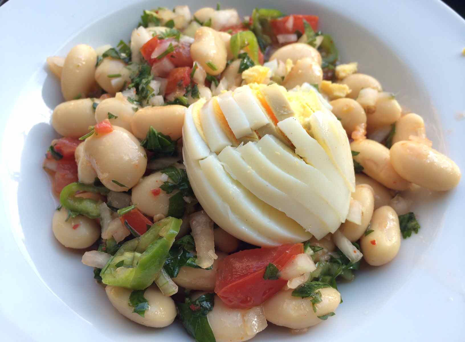 En nu moet ik zeker vragen wat de keuze was van...? ... Graag! Dat was de salata piyaz uit Antalya. Tot dusver het lekkerste zomergerecht wat ik dit seizoen heb gegeten. Een salade van witte bonen, verse tomaat, groene paprika, chili, mint, olijfolie, sesampasta (tahin), hardgekookt ei en pekmez.