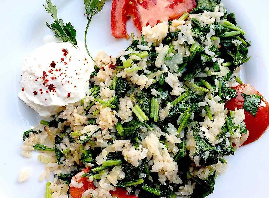Maar daarvoor ga je ongetwijfeld niet naar De Olijventuin. Klopt. Maak vooral een keuze uit de specifiek Turkse broodjes, salades, mezze en gerechten die ze er hebben. We noemen: de pides met Turkse salami of kaas, de herderssalade, de gebakken groenten met Turkse yoghurt en knoflook (Kizartma) en de Karnaiyarik: gevulde aubergine met gekruid rundergehakt en tomatensaus. Bij dit verhaal staat onder meer een foto van de Ispanakli pilav, een pilaf met de in Turkije zo geliefde wilde spinazie en yoghurt. Een nogal royaal opgediend bijgerecht, maar gezond en lekker. Dit was de keuze van mevrouw De Jong.