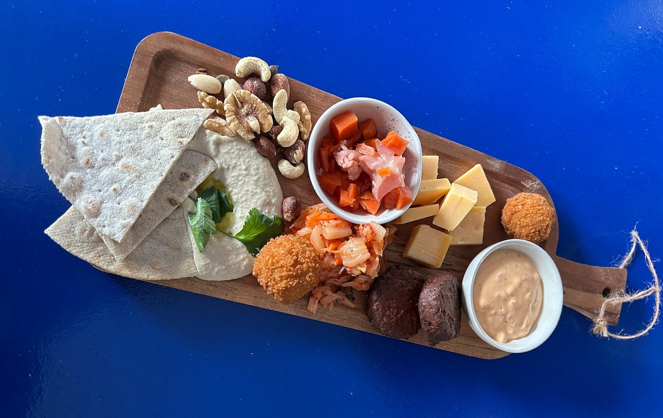 Zo kan de legendarische Rotterzwam bitterbal natuurlijk niet ontbreken. Naast deze oude bekende ligt er nog veel meer lekkers op de circulaire borrelplank. Denk aan flatbread met hummus, fermented pickles en kimchi.