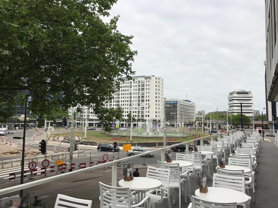 Naast de bekendheid van de eigenaar is het terras zonder meer het meest opvallende aspect van Blushing. Het is groot en maakt je direct deelgenoot van Rotterdam. Je kunt de Coosingel langs het stadhuis afkijken of juist via de Hofpleinfontein de Schiekade in je opnemen. Zelfs een stuk van de Weena ligt aan je voeten. Toch heeft het terras iets rustigs, zeker nu de bomen op hun groenst zijn. Met dit uitzicht kunnen we ons lijstje met dakterrassen wel verder uitbreiden, ook al bevindt het terras zich slechts op de eerste verdieping.