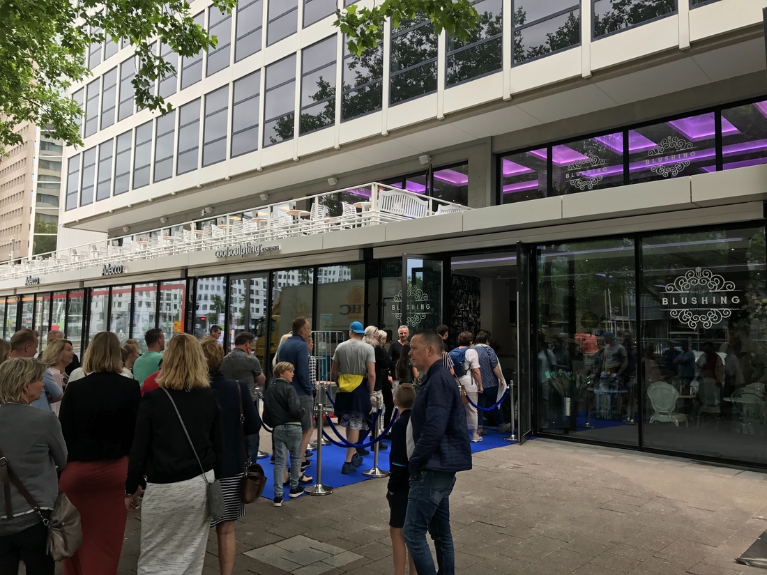 Gordon introduceerde de derde vestiging van Blushing met een gepikeerde post op Facebook, waarin hij Rotterdam en passant een van de hipste steden van Europa noemde. We zijn gevleid. Aangezien we bij De Buik niet doen aan koffietesten en al die Amsterdamse terraslijsten niet kennen, gaan we gewoon proef op de som nemen op de ochtend van de opening. De gekrulde marktman zelf is er niet, maar dat mag de pret niet drukken: er staat de hele dag een rij, praktisch tot aan de fontein. De ontvangst is goed, mede door een stel ras Amsterdammers op leeftijd. Zij pakken met typische mokumse humor zelfs de meest fervente Rotterdammers in.