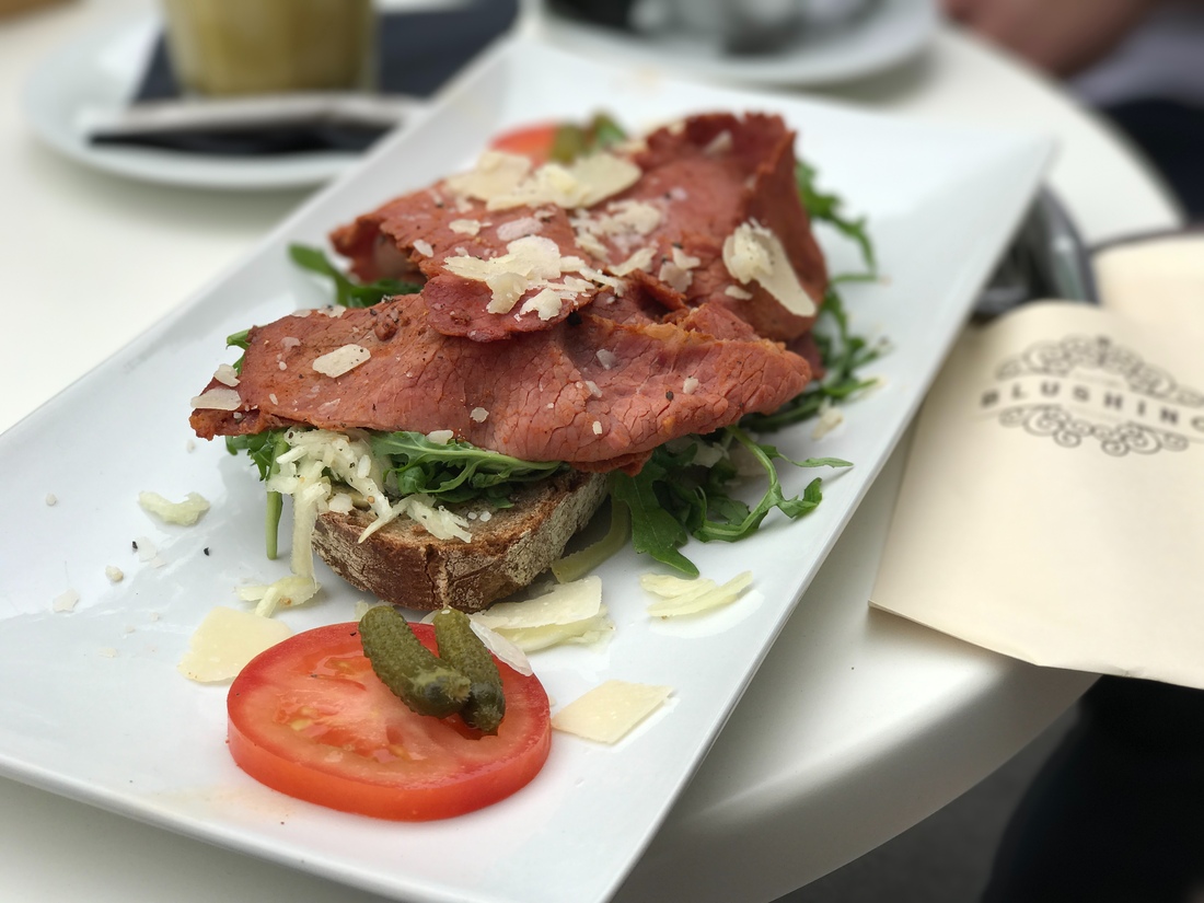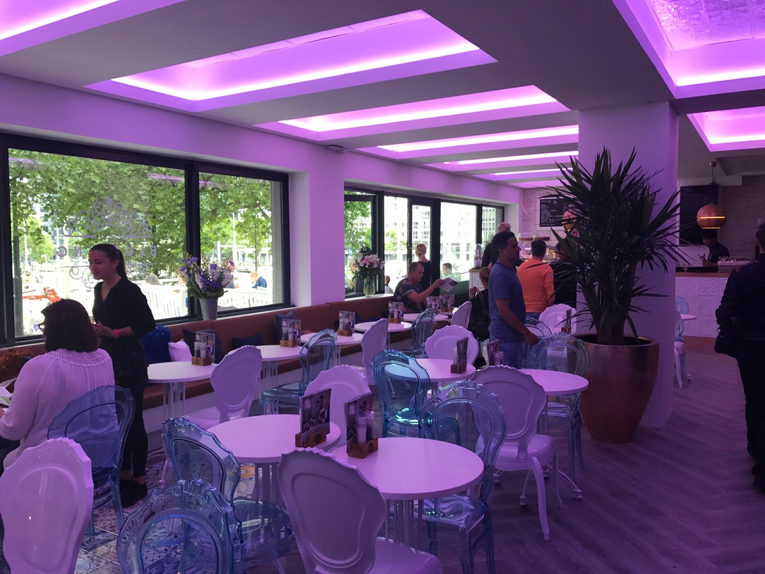 De ingang op de Coolsingel is voorzien van een blauwe loper en dat is maar goed ook, want het uitzendbureau ernaast steelt alle aandacht in de plint. Beneden is een juicebar en zijn een klein aantal zitplekken. Het grote geweld speelt zich boven af. De eerste verdieping baadt in paars licht dat in een gemiddelde shisha lounge niet zou misstaan. Als je boven komt lacht Gorden je op Godzilla formaat toe. Boven is ook de keuken waar de sandwiches en bowls bereid worden. De inrichting is verder wit en fris en kan zo uit de Rivièra Maison brochure komen. Het personeel is vriendelijk en straalt. Lange benen, strakke zwarte T-shirts, her en der een sleave (een arm vol tattoeages). Het is een fijne, Rotterdamse, mix van mensen. De gasten van Blushing zijn, zo mogelijk, nog Rotterdamser en het lijkt erop dat ze allemaal Gordon's avonturen volgen op TV en in de bladen.
