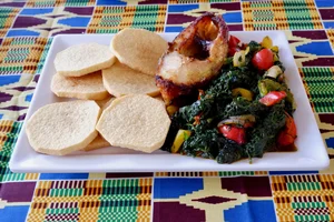 Na de menukaart ontcijferd te hebben, bestellen we vis met spinazie en gebakken yam en gekruide kip met gebakken banaan en een puree van zwartoog bonen. De kruidige, volle smaak van de gerechten valt meteen op, deze valt niet direct te plaatsen. De smaken zijn zwaar maar goed gebalanceerd, waarmee ons enthousiasme verder wordt gewekt. Bovendien zijn de porties ruim. Na het hoofdgerecht zijn we al goed gevuld, maar voor dessert is altijd ruimte. Het wordt millet, een rijstpapachtig toetje met griesmeel, krenten en ananassap. Hierbij wordt een drankje van Hibiscus geserveerd, zo mooi als die in de tuin staat zo lekker is het in het glas.
