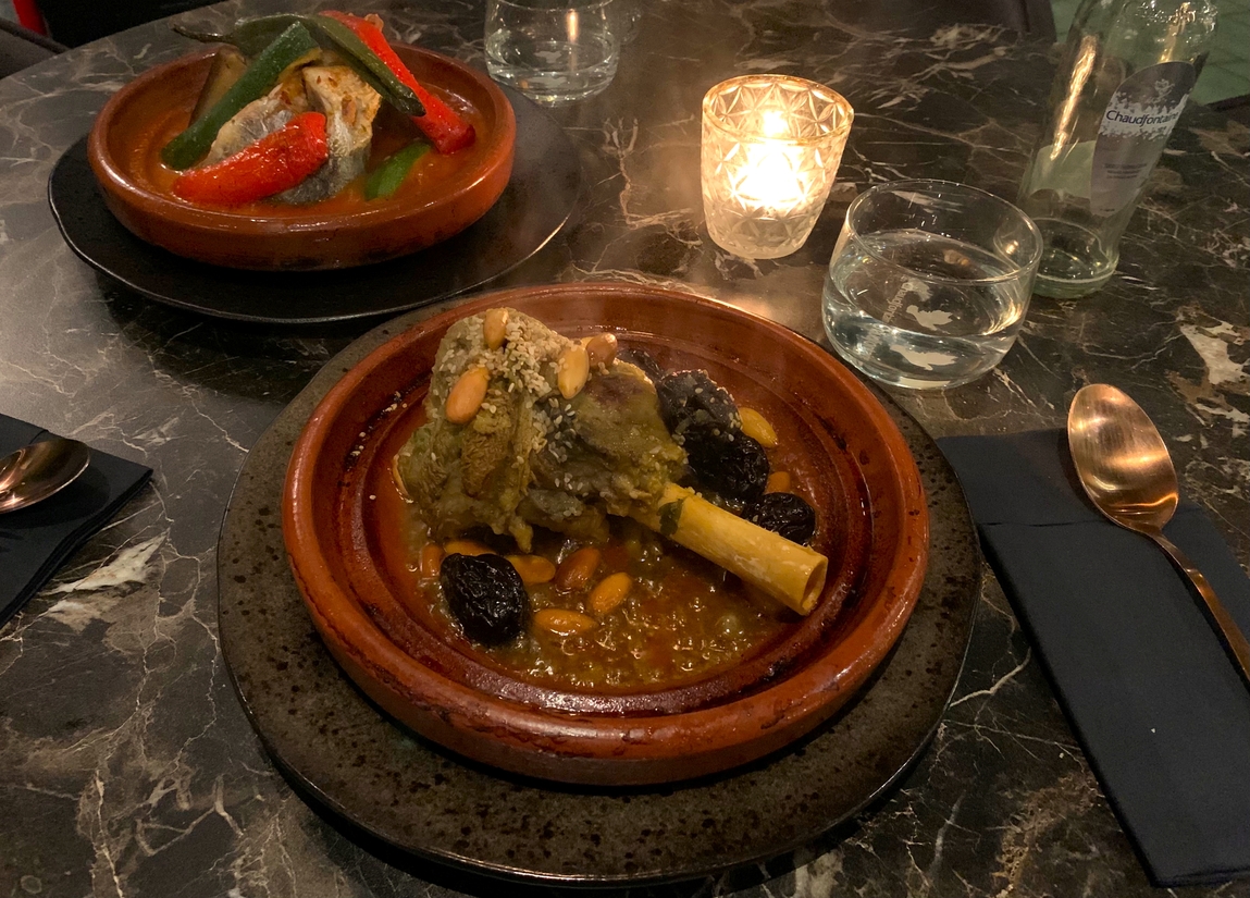 Als hoofdgerecht hebben we de lams- en vistajine besteld. De deksel van de tajine wordt aan tafel opgetild en een aromatische stoomwolk komt vrij. Hij komt af van de lamsschenkel die bijna uit elkaar valt als je er alleen maar naar kijkt. De amandelen en de pruimen die het stuk vlees vergezellen sissen nog na van de hitte en de olie. Daarna onthult onze ober de dorade in een tomatensaus met verse groenten. Deze ruikt heerlijk fris, wat komt door de citroen die duidelijk aanwezig is. Als laatste komt een mandje Marokkaans brood op tafel, een welkome spons om de lekkere sappen en sauzen uit de tahins mee op te dopen.