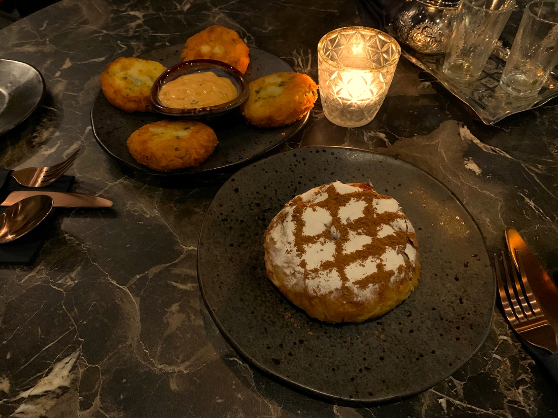 We laten ons graag leiden door de kundige bediening en nemen op aanraden de Kip Bastilla en Maakouda, gekruide en gefrituurde aardappelkoekjes, als voorgerecht. Niet lang na het bestellen krijgen wij de twee gerechten op tafel, met twee kleine bordjes erbij om te delen. De Kip Bastilla is een prachtige schijf van bladerdeeg die, na het snijden, zijn schat onthuld in de vorm van uit elkaar vallende kip en de geur van kaneel. De smaak is vol en de amandelen zijn een prettige toevoeging. De aardappelkoekjes doen denken aan een soort aardappelkroketjes maar dan plat en rond, en zijn lekker voor erbij.
