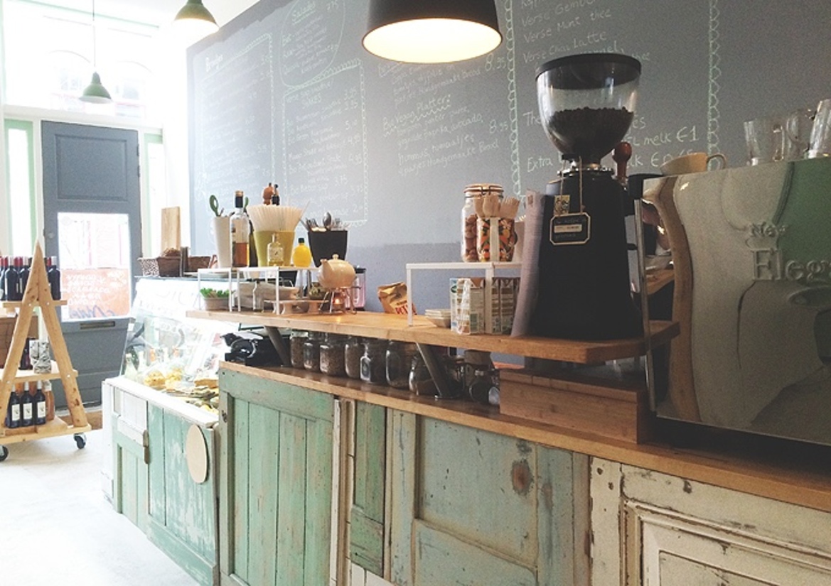 Tijdens het wachten kan ik alvast even goed naar het interieur kijken; het is een mooie ruimte met veel natuurlijke lichtinval en zachte kleuren. De meubels zijn van blank, onbewerkt hout en de vloer is van beton, waardoor het geheel rustiek aan doet. De kroon op het werk is de toonbank van verweerde, houten kastdeuren in verschillende tinten prachtig mintgroen. Ik ben er gevoelig voor.