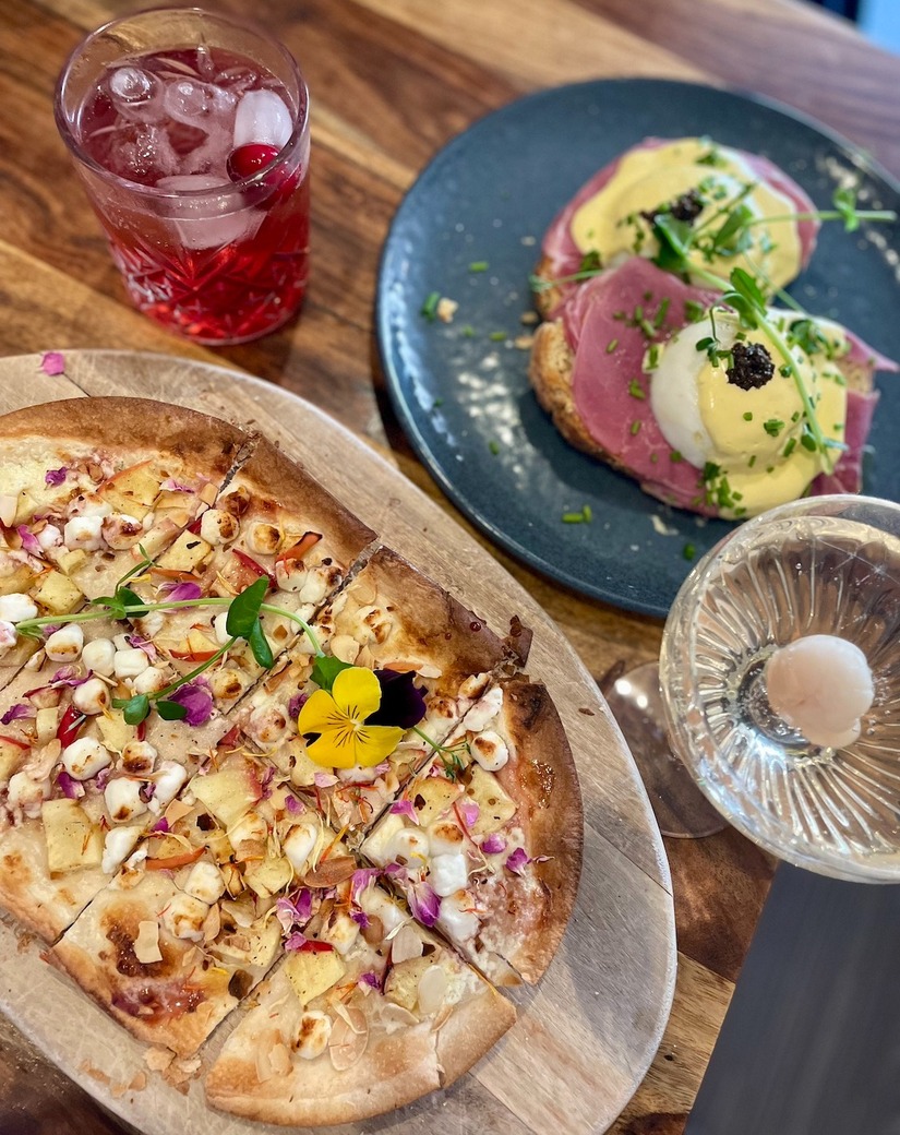 Eén van onze favorieten is de truffle benedict, die bestaat uit gepocheerde eitjes op een knapperige toast met kruidige pastrami, afgetopt met een romige hollandaise saus en truffel. Ook de flammkuchen met de frisse combinatie van appel, geitenkaas en amandelen gaat er goed in.