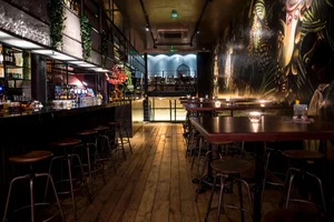 De zaak is qua inrichting een allegaartje aan stijlen. Van de ruitjes op de vloer in de toiletten tot de gelakte bakstenen aan de gevel en al het stoers en intieme ertussen in. Eyecatcher is de zaakbrede muurschildering tegenover de bar. Pim vroeg Rotterdamse kunstenaars om geïnspireerd op Philippe Starck iets te