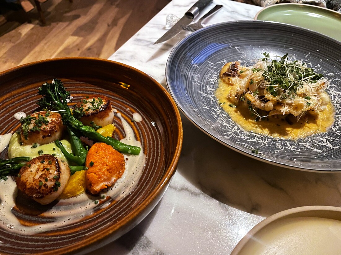 We hebben de menukaart inmiddels aandachtig kunnen observeren, de voors en tegens van keuzes af kunnen wegen, en besloten welke gerechten we absoluut moeten proberen voor we het pand verlaten. We trappen af met coquilles met broccolicrème en een waardevolle toevoeging van sinaasappel en sobrasada, een smeerbare Spaanse worst, vergelijkbaar met het Italiaanse ‘nduja maar iets zachter van smaak.