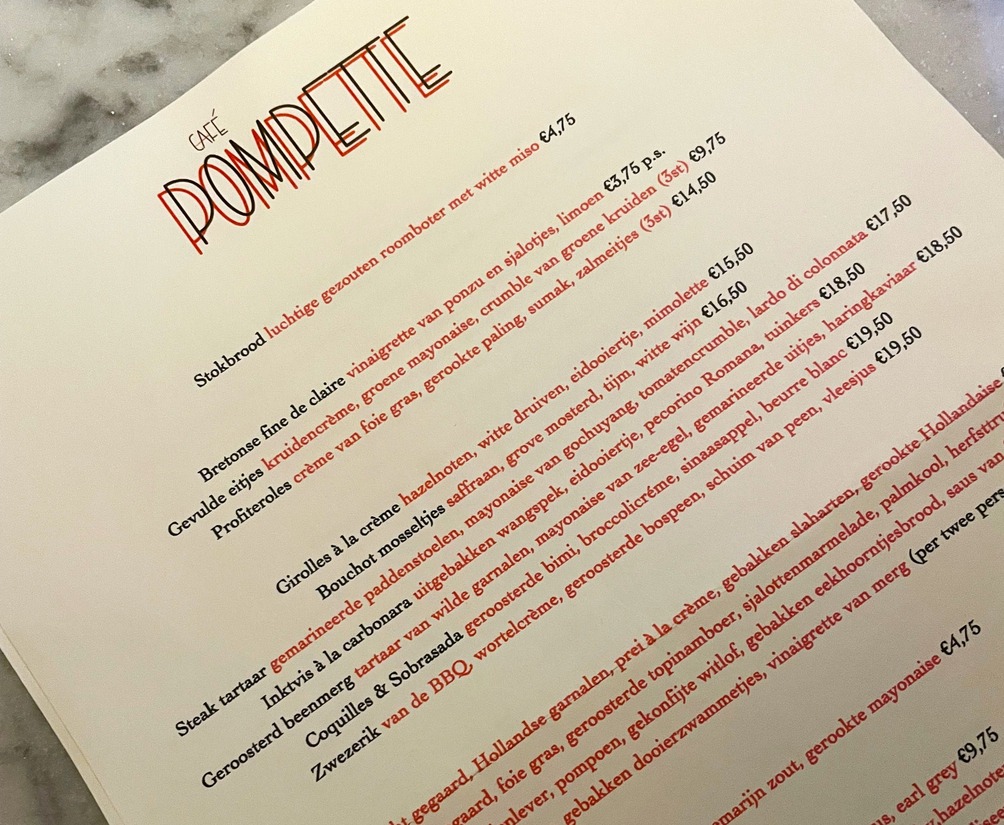 De menukaart van Café Pompette zorgt direct voor teleurstelling: helaas zijn we maar met zijn tweeën en is alles van de kaart bestellen iets teveel van het goeie. Waar je bij veel restaurants van de kaart kiest wat je lekker lijkt, moet je met zoveel goede gerechten bij Pompette bepalen wat je jammer genoeg níet kunt bestellen. Met een bijna wekelijks wisselende menukaart kan het zomaar zijn dat een gerecht er bij het volgende bezoek niet opstaat, dus het maken van een keuze is een flinke opgave.