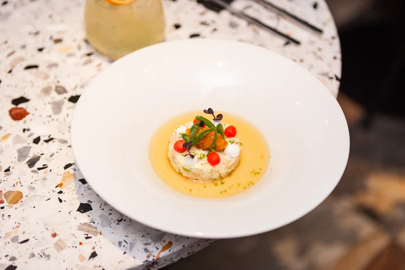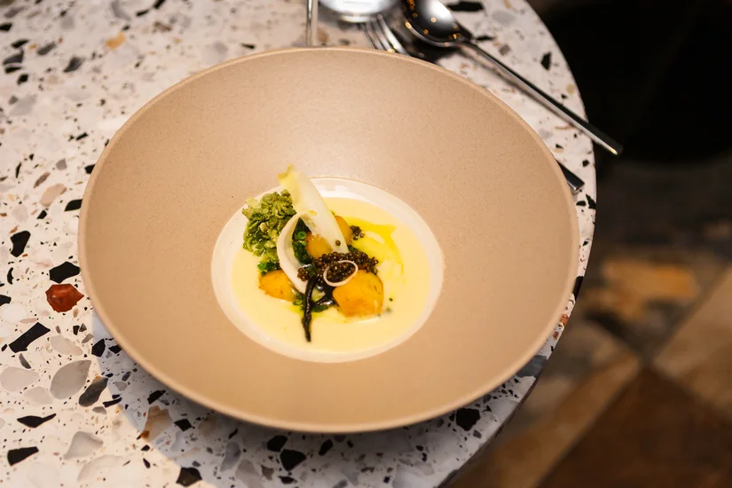Wij kiezen voor het vijfgangenmenu en beginnen met de hamachi. De frisse smaken en het aroma van de kaffir limoen maken het gerecht levendig, terwijl de dashi-dressing de vis omhult en zijn rijke, natuurlijke smaak behoudt. Dit eerste gerecht toont direct hoe het menu traditie en innovatie combineert.
