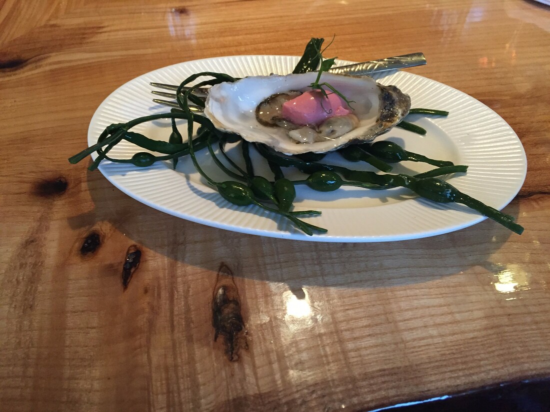 Vandaag kiezen we niet. We geven kok Gerrit de vrije hand. En dat blijkt een goede zet. We beginnen met een oester en ijs van rode biet (4 euro). Daarna krijgen we gamba’s met pompoencrème, witlof, amandel en saus van kreeft (7,50) en gebakken schrei. Hoogtepunt is de entrecote. Klein, knapperig, rood van binnen. Het is een smaakexplosie. Samen met de frites alleen al de reis waard.