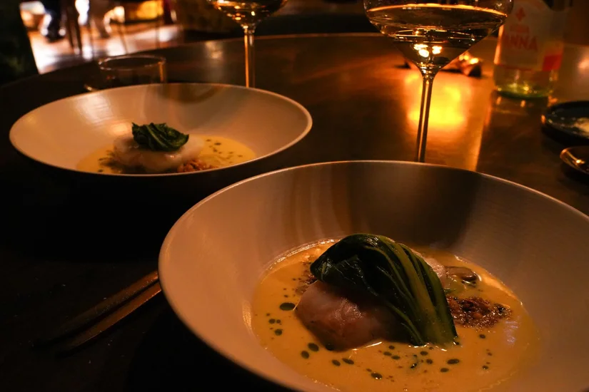 De volgende gangen bouwen verder op die mix van culinaire invloeden. Een boterige, frisse skrei met beurre blanc en shiitake: klassiek Frans uitgevoerd. De spitskool, verbrand in z’n jasje, is van binnen zacht, bijna vlezig en krijgt een Aziatische twist met miso en een mild pittige XO-saus. Het is een machtig gerecht, desondanks drinken we de beurre blanc nog net niet op.