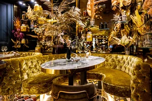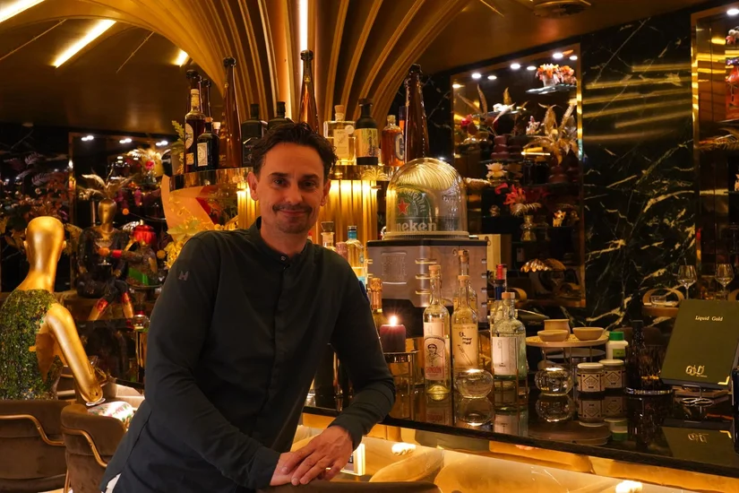 Het waait nog net winterhard als we in Delfshaven aankomen, maar binnen bij GOUD voelt het meteen warm: overal fluweel, veren en uiteraard heel veel goud. De gouden bar en open keuken trekken de aandacht, maar vooral de energie van de zaak valt op.