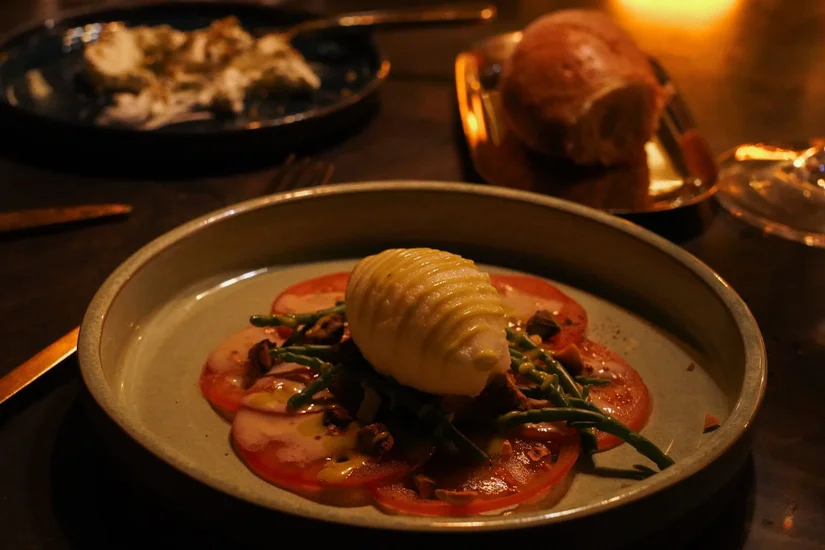 Na plaatsnemen volgt een tafel vol kleine bites waarin vooral de Spaanse invloeden, een van Nick’s favoriete keukens, naar voren komen. De croquetas van ossenstaart zijn romig en vol van smaak. De tosti met pata negra is vrij simpel en licht ziltig. De boquerones zijn zurig met een zachte textuur.