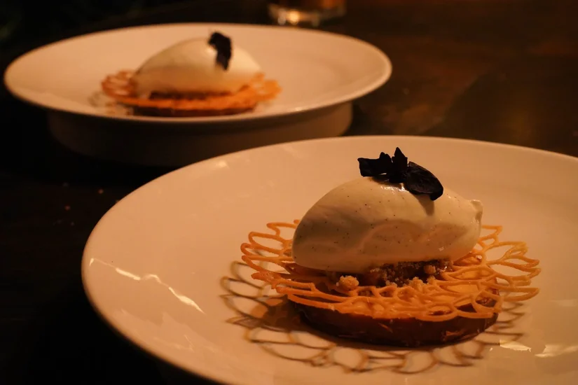 Het dessert sluit de avond af met een combinatie van bittere bloedsinaasappel, chocolade, krokante kataifi en een fluweelzachte vanillecrèmeux.
