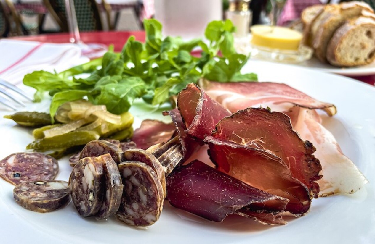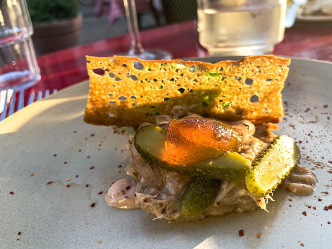Chef Nils mag ons verrassen met zijn keuze uit de gerechten. Karin schenkt daar de passende wijnen bij. Als worstmaker val ik meteen met mijn neus in de 'reuzel'. De eerste gang bestaat uit een bord huisgemaakte charcuterie. Droge worst, coppa en bresaola. Dat komt, huischarcutier Maria liep ooit stage bij een slagerij. "Er stond hier toch een wijnkoelkast leeg. Nou, dan is een rijpingskast voor charcuterie wel een héél mooie bestemming." De droge worst heeft een mooi pepertje, net zoals de coppa. We herkennen in de bresaola kruidnagel, niet echt een Italiaans ingrediënt. Maria: "Die kruidnagel in de bresaola is geïnspireerd door iets moois wat we bij een slager in de Achterhoek tegenkwamen. En we nemen gewoon de vrijheid om mooie eigen smaken te maken." Sommelier Karin schenkt er Blanquette de Limoux bij. Gemaakt van de mauzac druif. Brut nature, licht mousserend, droog, soepel en wat citrus, wat goed past bij de vleeswaren en ook bij l’oeuf mayonnaise die daarop volgt.