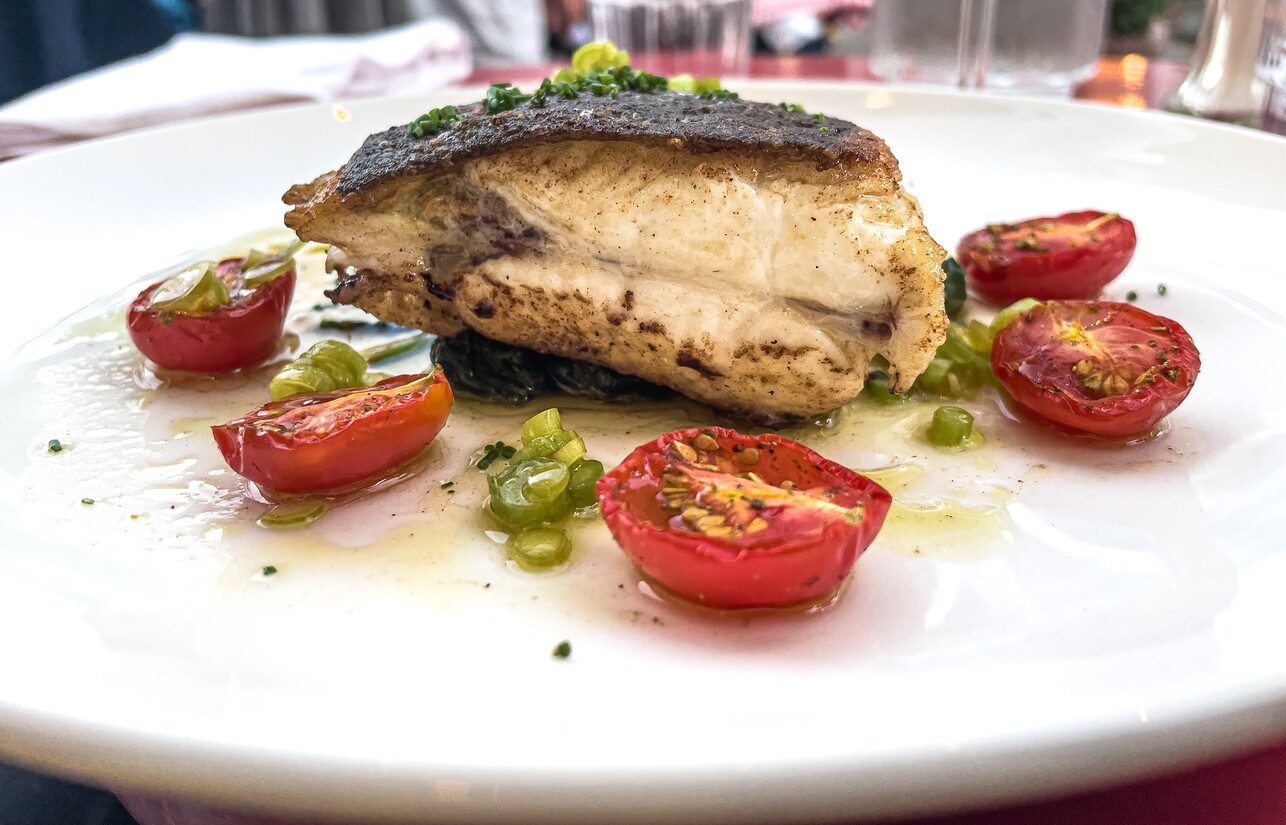 Voor de volgende gang worden onze glazen gevuld met een rosato van nero d'avola en een claret, een lichte rode wijn gemaakt van syrah, grenache noir en blanc, van de voet van de Mont Ventoux, Frankrijk. Die passen goed bij de jonge geitenkaas met pruim, walnoot en pruimensaus en bij de rillettes de porc met gelei van piment d’espelette en cornichons. De rillettes is mooi zacht en romig en de gelei zet er een mooi pitje tegenaan. De pruimensaus tilt de kaas boven zichzelf uit. Daarna de reden waarvoor we eigenlijk kwamen: de mosselen. Die zijn gekookt in absinth met knoflook, bestrooid met gehakte kervel. Precies zoals we ze het liefst eten: nog mooi zacht. De smaak van de absinth is het extraatje. We delen de mosselen en de gefrituurde courgettebloem gevuld met ricotta die ook op tafel komt. De witte Cinzia van druifsoorten friulano en pinot bianco past goed bij beide gerechten. Licht, wat zwavel, daarna mineralen en een zuurtje van groene appel.