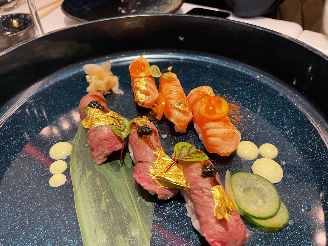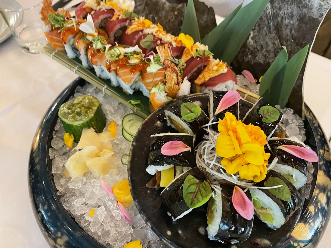 Vervolgens krijgen we een sushi plateau vol diverse rollen. De sushi bestaat uit knapperige en zachte combinaties die een nieuwe ervaring geven. Met de kleurrijke toppings van sauzen en bloemen, is de presentatie van het sushi plateau extravagant te noemen. Hiernaast word een plateau met rice crispies neergezet. Deze hapjes zijn even gebakken waardoor de rijst een knapperige structuur heeft, erop zit zalm en tonijn. Het knapperige weegt mooi af tegen het zachte van de vis.