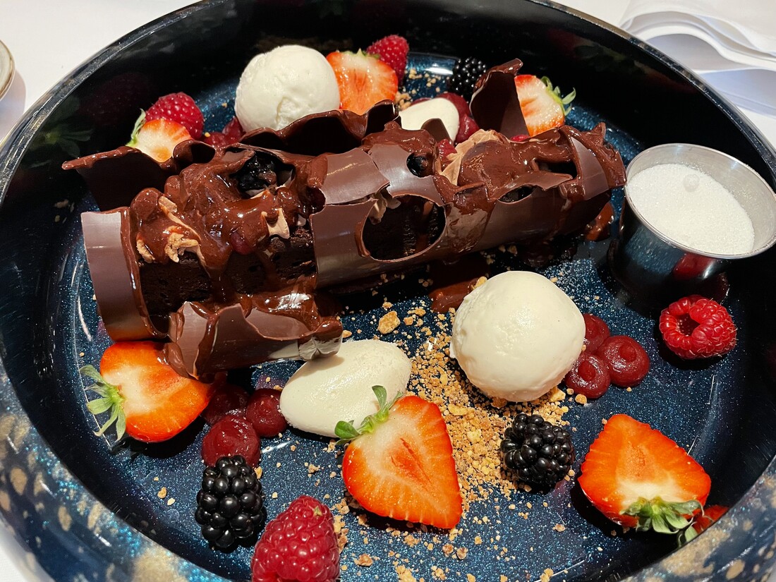 De gastvrouw zet een grote schaal op tafel met een koker van chocola, vergezeld door bolletjes ijs en bosvruchten. Hier overheen schenkt ze een warme chocoladesaus, die de rol laat breken. Verstopt in het omhulsel vinden we chocoladebrownies en chocolademousse; het dessert is de droom van iedere chocoladeliefhebber. Het machtige van de chocola wordt mooi aangevuld door de vruchten en het ijs gemaakt van tonkabonen met vanillesmaak. Verder op de tafel staat de deconstructed Pornstar Cheesecake, de populaire cocktail verwerkt in een toetje. Het dessert is wat lichter dan het chocoladedessert, zoet, fruitig en fris door de combinaties van verschillende ingrediënten. De cheesecake met passievruchtsmaak wordt omringd door champagneschuim en passievruchtsorbet. Dit dessert is simpelweg genieten.