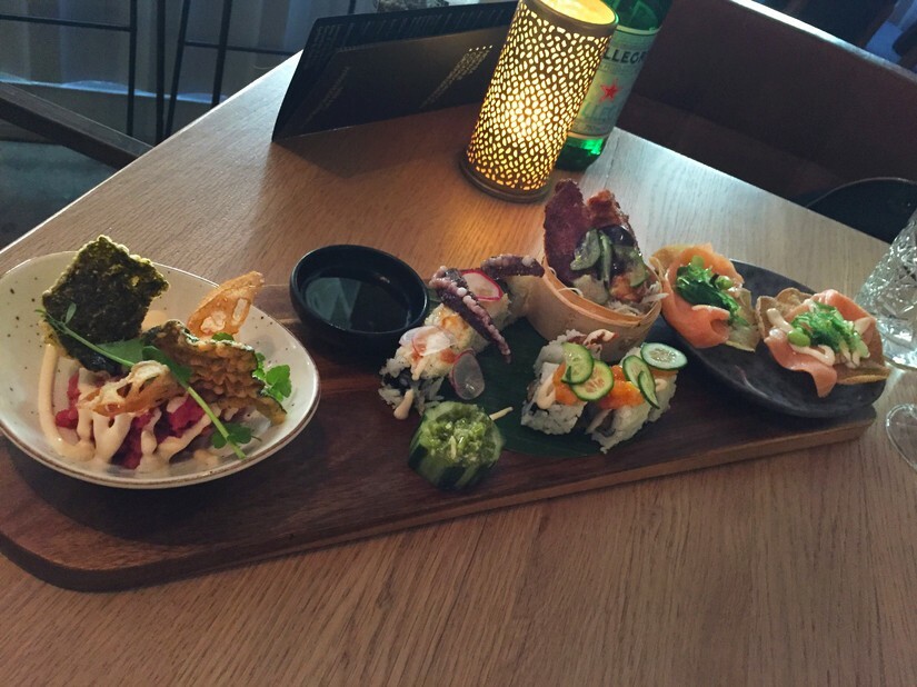 De eerste ronde bestaat uit diverse Aziatische gerechtjes. De voorgerechten zien er stuk voor stuk prachtig uit. We krijgen Asian rundertartare (met bosui, norichips, sesamsoja en edamame met Black Pearl kaviaar), Duck HUGH (met komkommer en hoisinsaus) en zalmtataki op yanikeke (met edamame, radijs en sojamayonaise). De combinaties zijn verrassend en elk gerechtje is voorzien van een prettige kleine crunch. Erbij nog twee soorten sushi: ebi maki (met mangochutney, avocado, chili en Japanse mayonaise) en een teriyaki-rol met geflambeerde zalm, avocado, bosui en soja). De gerechtjes zijn allemaal erg smaakvol en verdwijnen dan ook razendsnel van de borden.