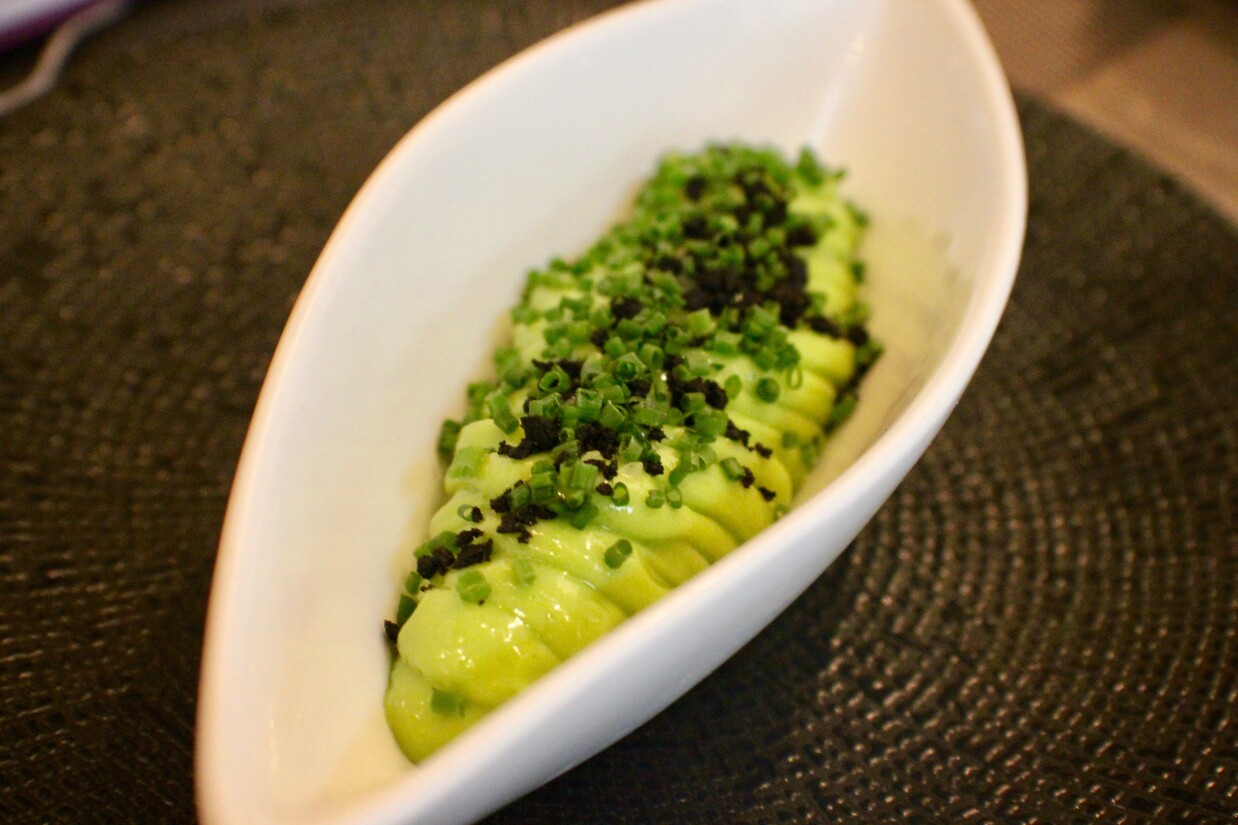 Na alle mooie woorden over de Baskische keuken, zijn wij uiteraard razend benieuwd geworden naar de gerechten. Op tafel staat bieslookboter, Euskadi’s variant op brood met ‘standaard’ boter, die zij zelf maken. Boter die je ‘gelijk kunt smeren’, en nee dat is echt niet zo vanzelfsprekend als het klinkt, wint bij ons sowieso altijd punten, maar van deze zouden we ook graag een bakje mee willen naar huis. Is het raar om een lepel te vragen en de boter hiermee naar binnen te werken? Vervolgens worden er garnalen-hamkroketjes en biet tartaar geserveerd, de variant op de steak tartare. Die overigens net zo oogt als zijn niet vegetarische versie.