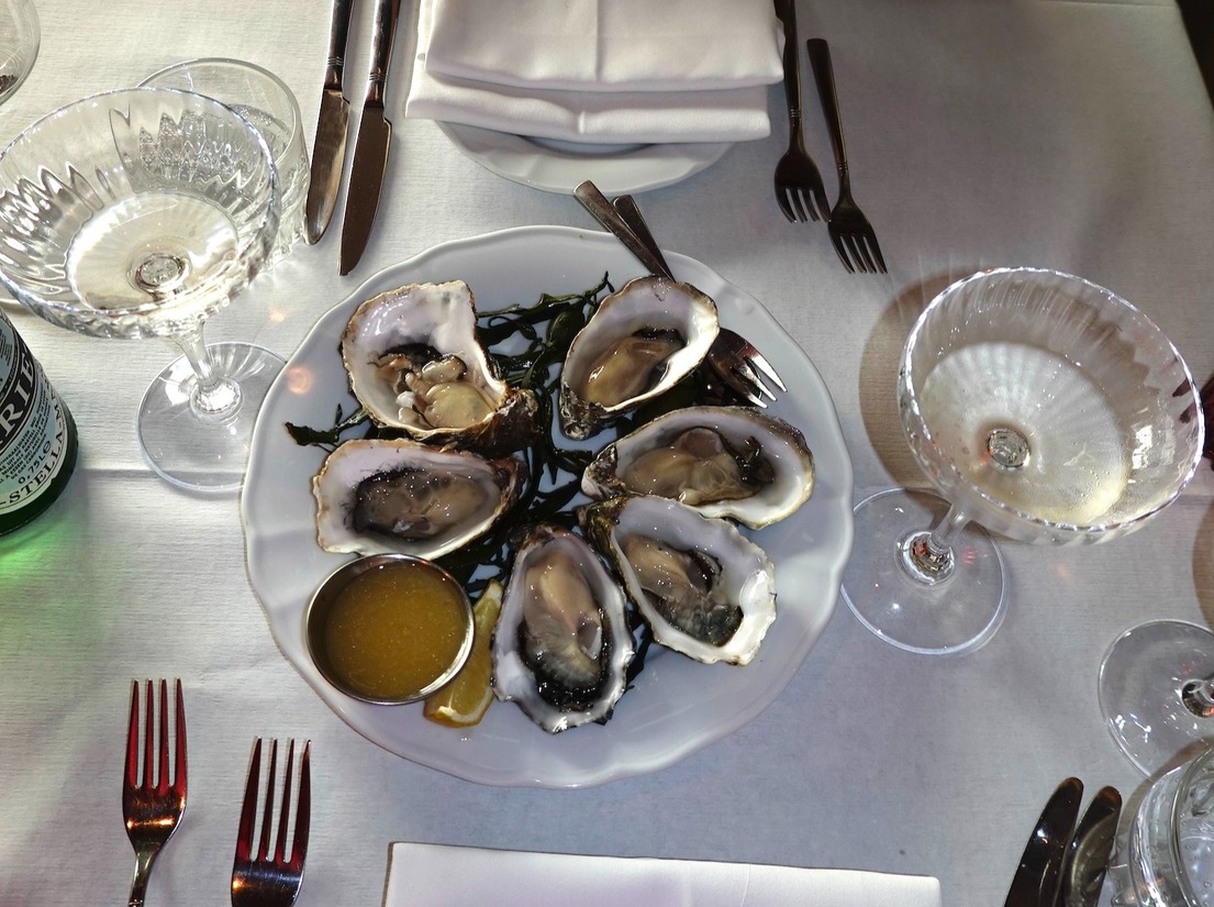 Een Frans diner zonder oesters? Onmogelijk. En dus begonnen we goed: met een oesterproeverij en een glas crémant d’Alsace van Balthazar Fry. De oesters kwamen uit Zeeland, Normandië en Japan. Vooral die laatste blijft je bij.