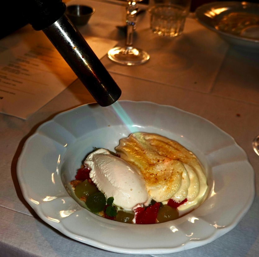 Toegegeven: bij elk diner kijken we toch het meest uit naar het dessert. En dit bord sabayon met gemarineerde meloen en grapefruit stelde verre van teleur. Als kers op de taart werd de sabayon aan tafel geflambeerd. Deze smaken, fris en zacht, gingen goed samen met de dessertwijn: Gewürztraminer Réserve van Balthazar Fry uit de Elzas.