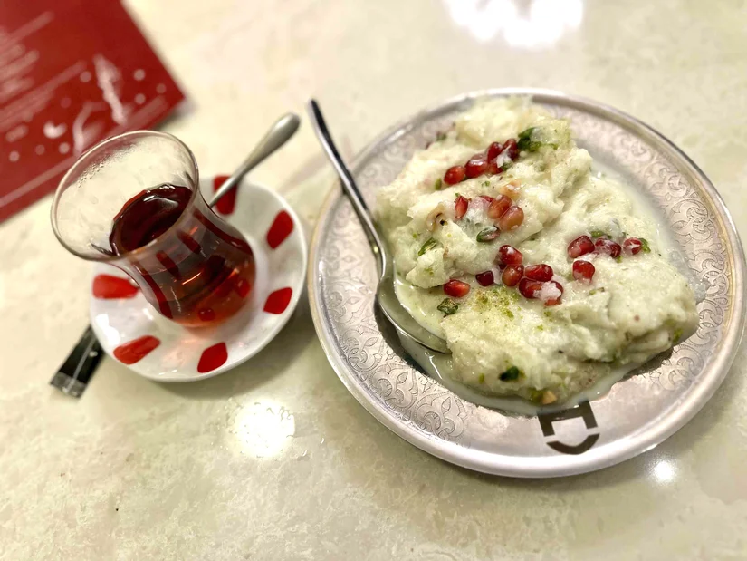 Op het menu staan naast zes lahmacun nog enkele mezze, een soep van de dag en twee desserts. Wij hadden geluk er was een extra dessert vanwege de ramadan: güllaç, extreem dunne zetmeelbladeren, gebakken op de plaat en vervolgens gedrenkt in melk en afgetopt met pistache en granaatappel. We zouden het superdunnen crèpes willen noemen, maar laten het maar bij güllaç.