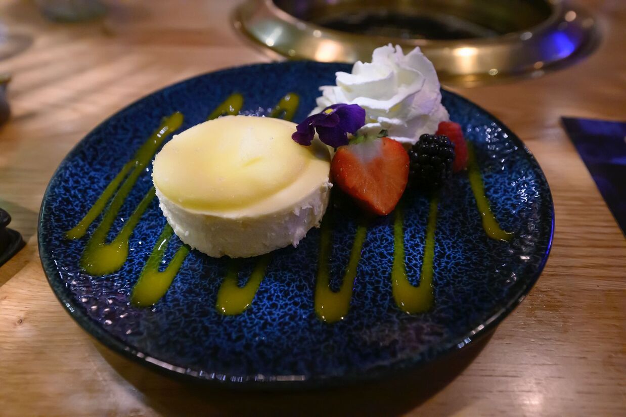 Het dessert is licht en elegant: Yuzu Lemon Cheesecake zonder bodem, luchtig en bijna mousseachtig. De yuzu zorgt voor een verfijnde citrusfrisheid, de citroen voor balans. Een verademing na de rokerige intensiteit van de BBQ.