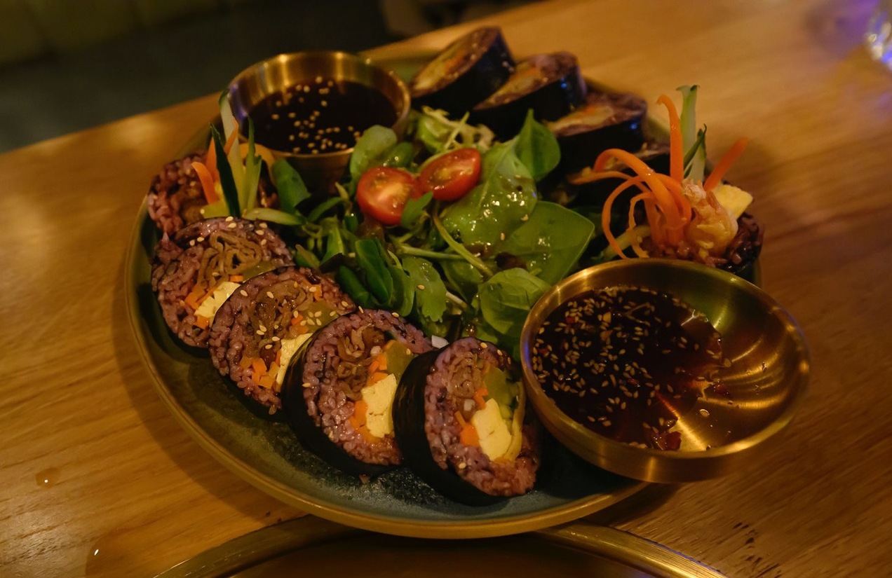 De kimchi van spitskool is licht gefermenteerd, friszuur en pittig zonder te overheersen. Een toegankelijke versie van een nationaal symbool. De gimbap met rund en garnaal is rijk gevuld en stevig gerold; het contrast tussen het zilte zeewier, de geurige rijst en de malse vulling is perfect in balans.