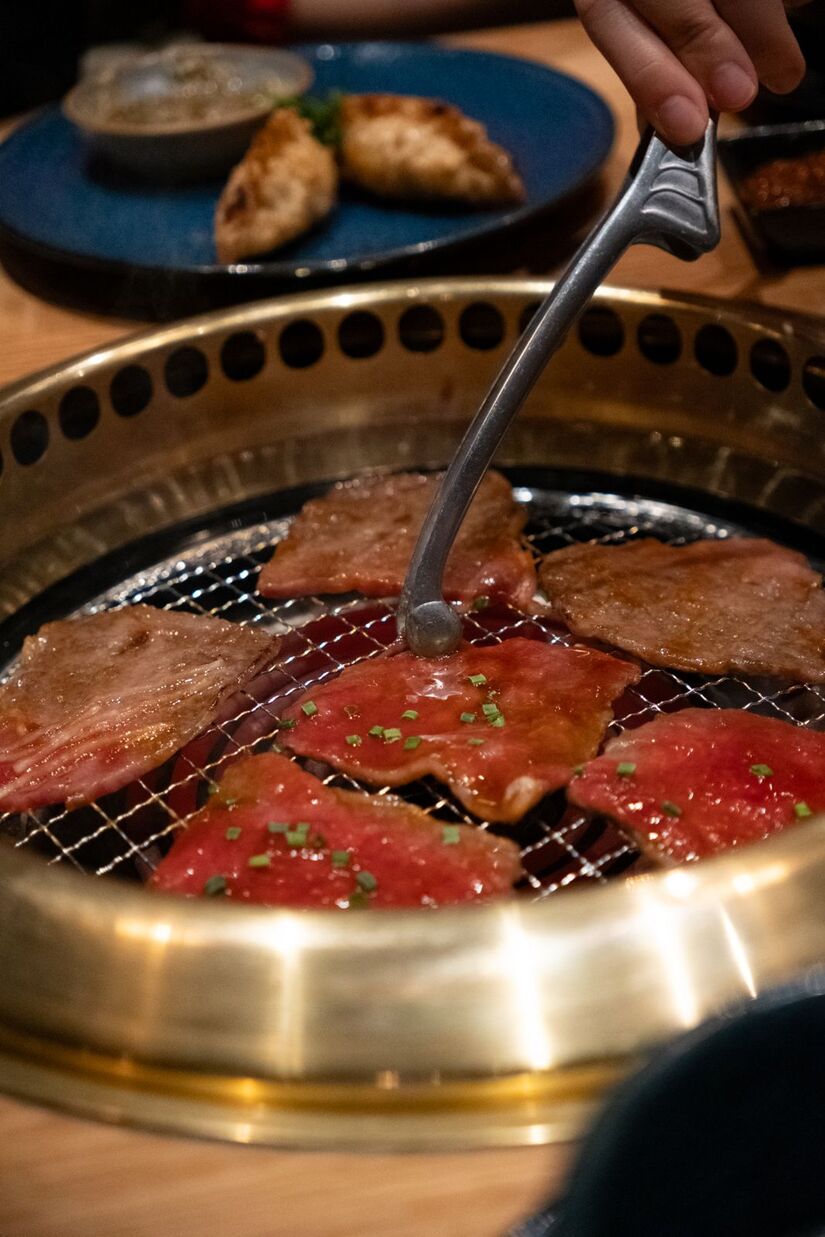 Op tafel verschijnen schalen met wagyu short ribs, wagyu rib-eye, Iberico-nek, grote garnalen, paddestoelen en verse groenten. De structuur van het vlees is boterzacht; het gaart razendsnel op het hete oppervlak. De garnalen krijgen een lichte rooksmaak, de enoki-paddenstoelen blijven veerkrachtig en sappig.