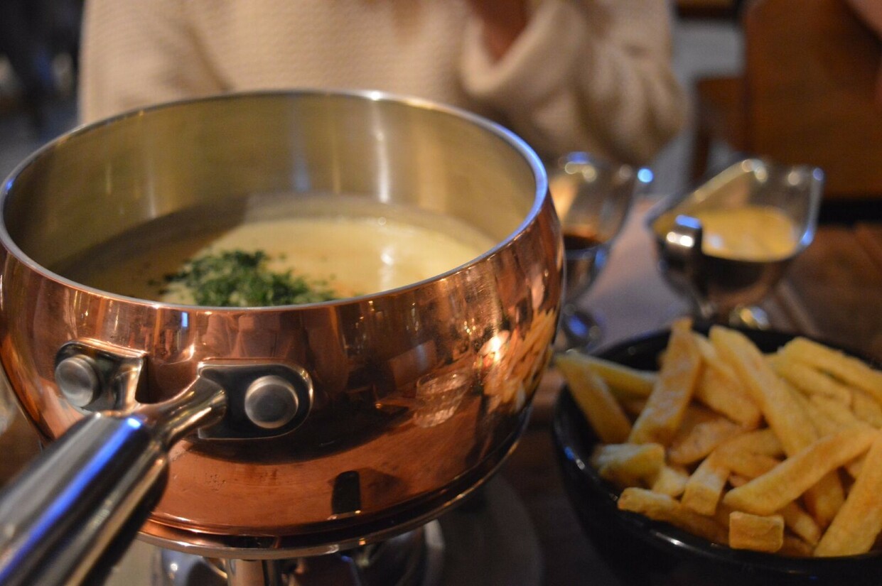 We starten met wat vitamientjes in de vorm van een smoothie. Die smaakt heerlijk en er is keuze genoeg. De serveerster - met het zout nog in het haar - schotelt ons een heerlijke caesarsalade voor. Precies zoals hij hoort te zijn en zelfs het kleinste formaat is meer dan genoeg. Dan is het tijd voor de kaasfondue. Gezellig dippen in een pannetje Gruyère en Emmentaler, met champignons, bloemkool, radijsjes, aardappel, ham, worst, brood en noem het maar op. Een droom voor iedere kaasliefhebber. Glaasje rood erbij, niets meer aan doen. We genieten intens en verlaten de zaak met open broeksknopen. Snel weer terug!